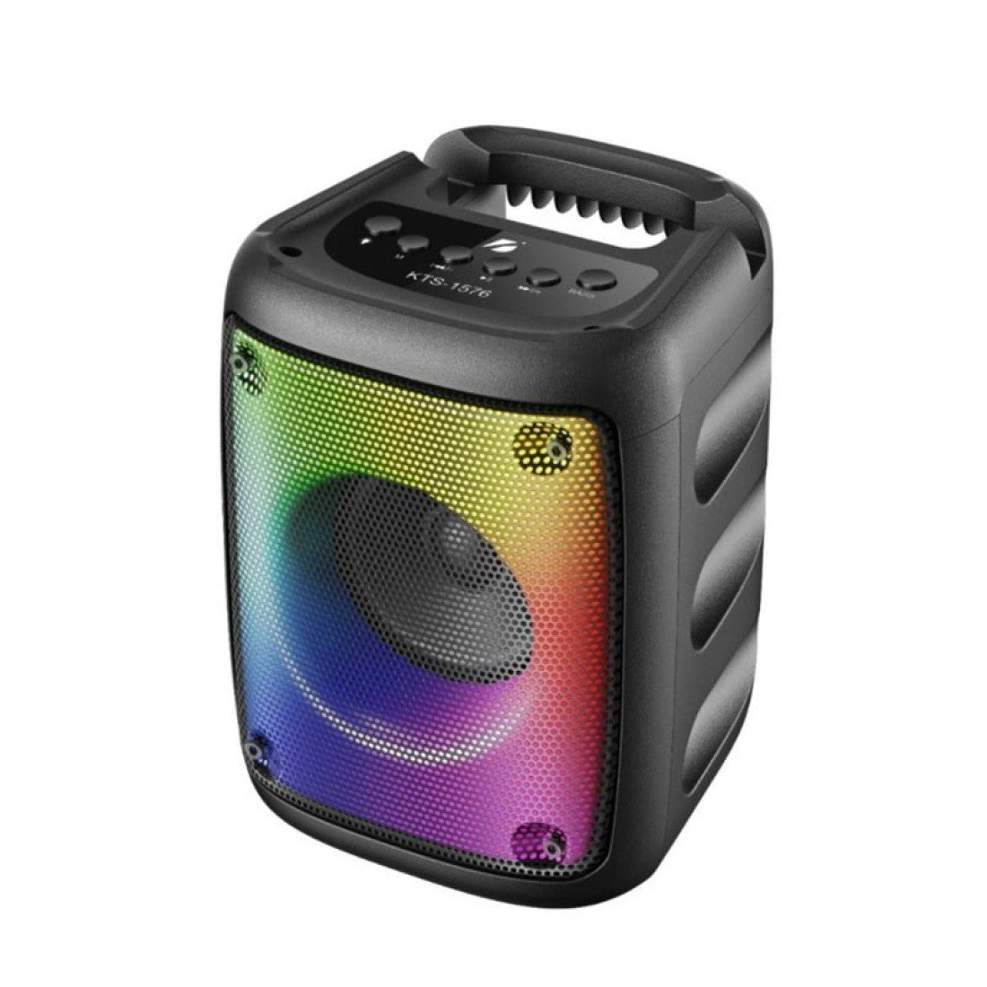 Караоке колона KTS 1576 е преносима Bluetooth тонколона с вграден акумулатор, цветомузика и компактни размери, подходяща за домашни партита, празненства и къмпинг излети, където няма електричество.